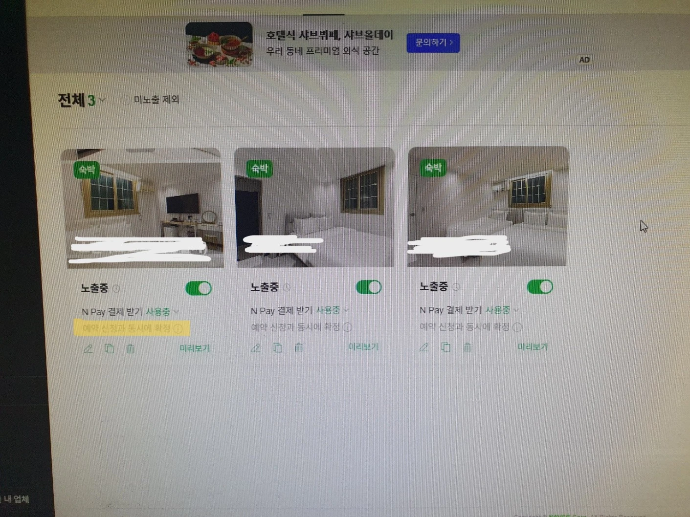 - 업체등록할실 때 등록하신 객실목록들이 보여지는데 사람들이 숙박을 볼 수 있는 방은 볼 수 있지만 Npay 결제받기를 보시면 사용안함으로 되어져 있는 것이 보일꺼예요. 그것을 사용중으로 변경을 해주시면 됩니다.