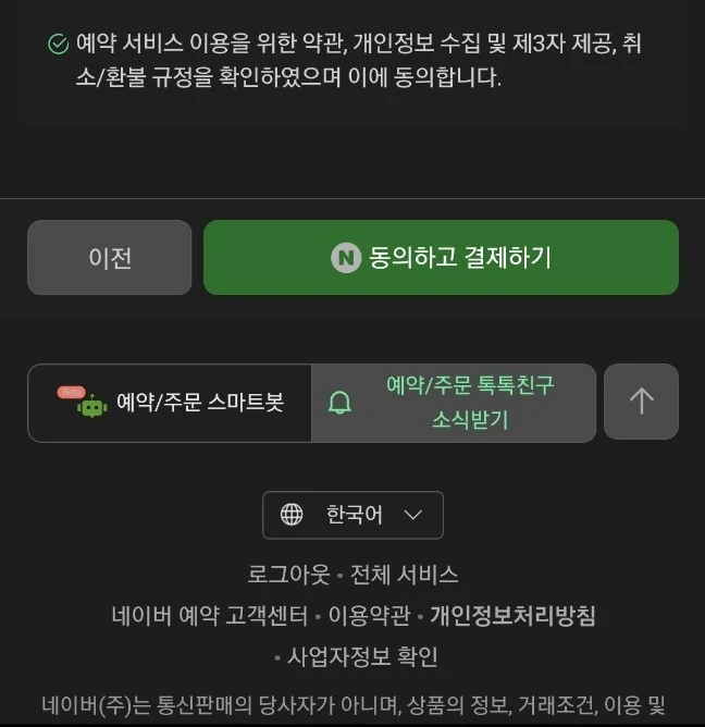 - 그러면 손님들은 예약하시면 확인 후 예약만 받는 것이 아니라 동의하고 결제하기로 넘어가기 버튼으로 바뀌어 있는 것을 확인하실 수 있습니다.