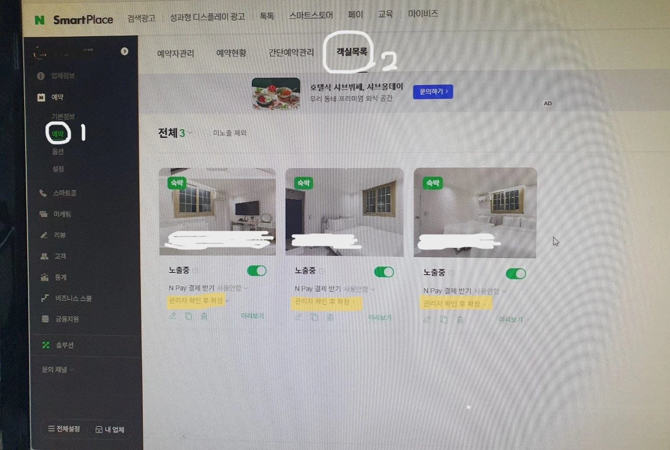 - 네이버플레이스에 업체로 들어가시면 왼쪽사이드바에서 예약버튼이 있습니다. 눌러주시면 상단에 예약자관리/예약현황/간단예약관리/객실목록 중 객실목록을 클릭합니다.